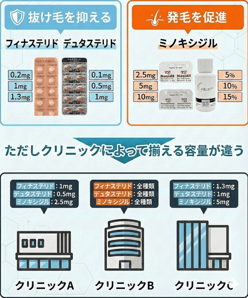 多くのクリニックでは、扱う種類はほぼ同じ。