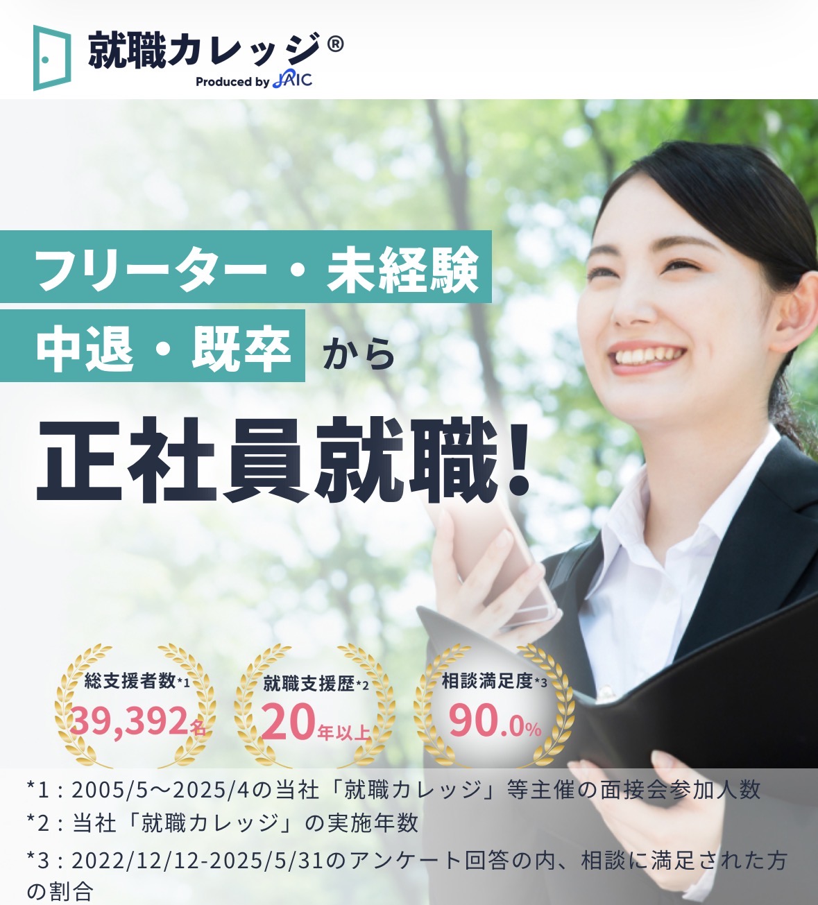 就職カレッジは正社員未経験のフリーターや中退者の方の正社員就職に強く、手厚いサポートを提供しています。