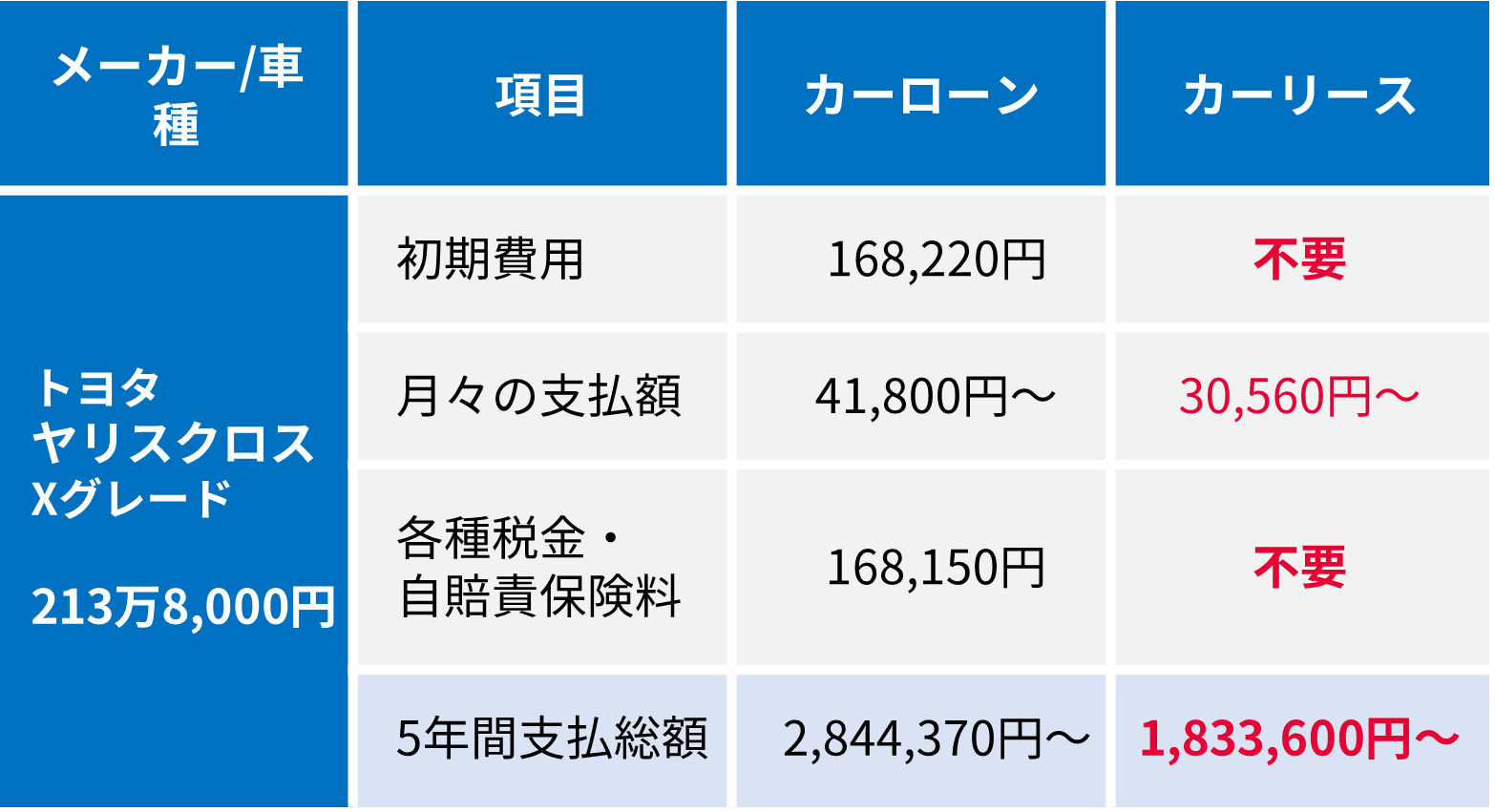 このように、5年間の比較では、カーリースのほうが月額で1万円、支払総額で100万円以上安い結果となりました。