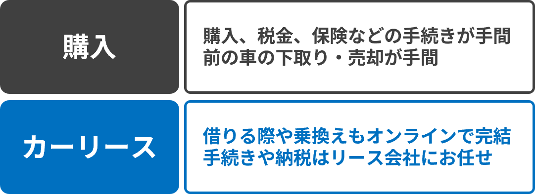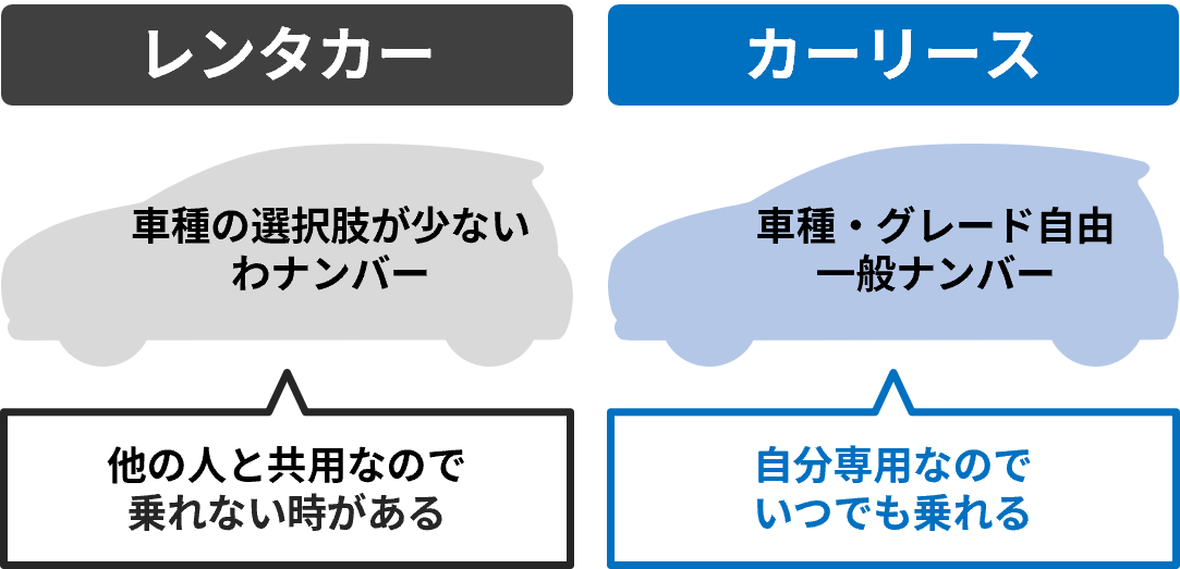 一方、カーリースは購入する場合と同じように、自分専用の新車なので車種やグレード、オプションなどを自由に選べ、自家用車のように利用できます。