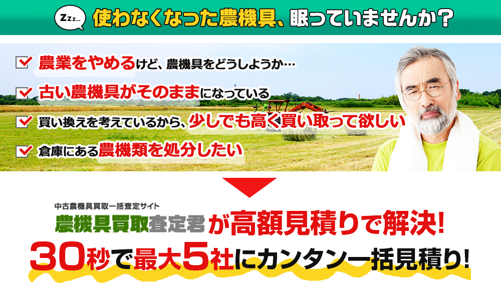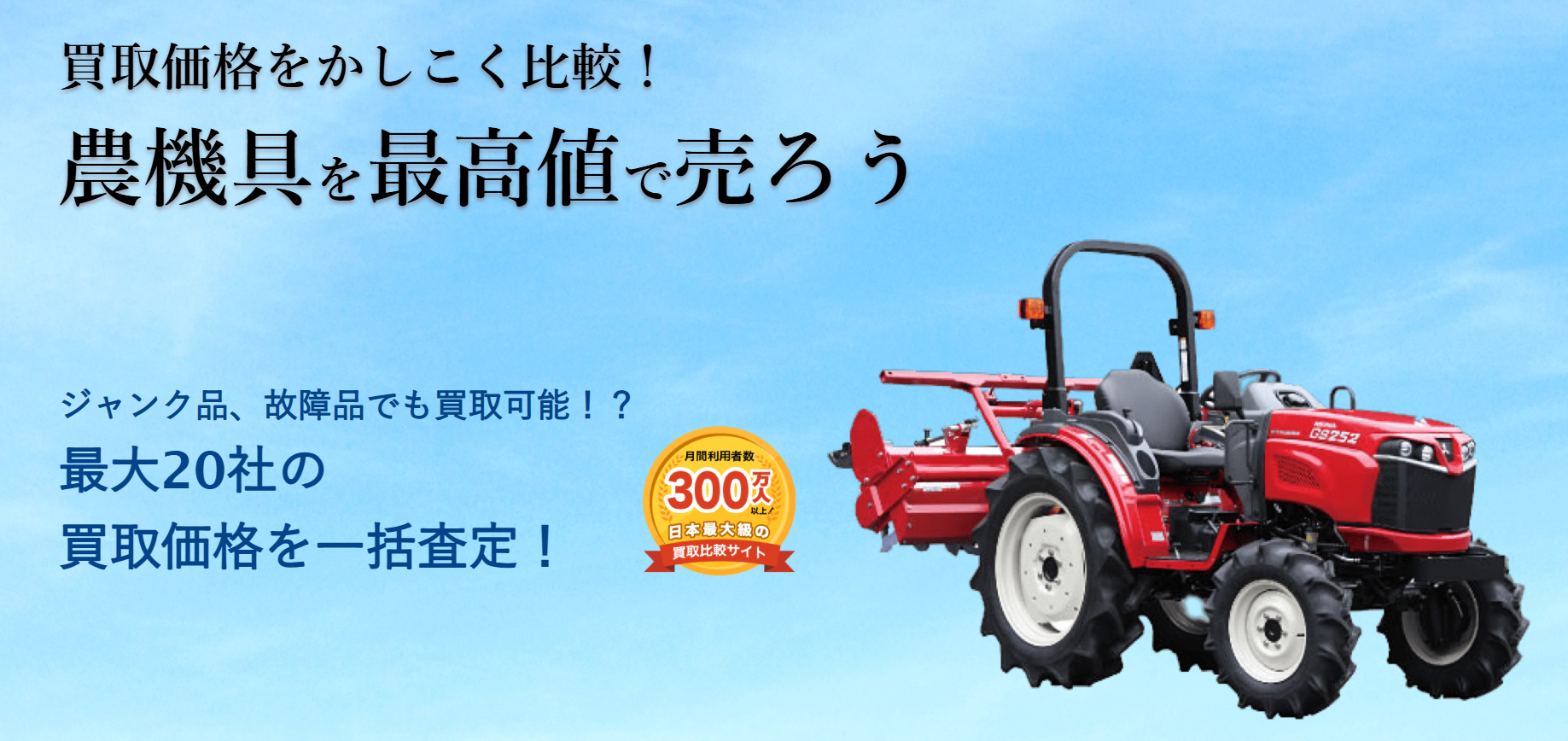 旦那と私の体力には農作業もう難しいので、今後の生活費を考えると、倉庫にある農機具をできるだけ高く売りたいと思い、友人のおすすめでここで査定してもらうことになりました。写真と名前を入れるだけで、一括全国比較できるから、とても簡単!来てくれた業者も親切で、対応が早く、安心しました。