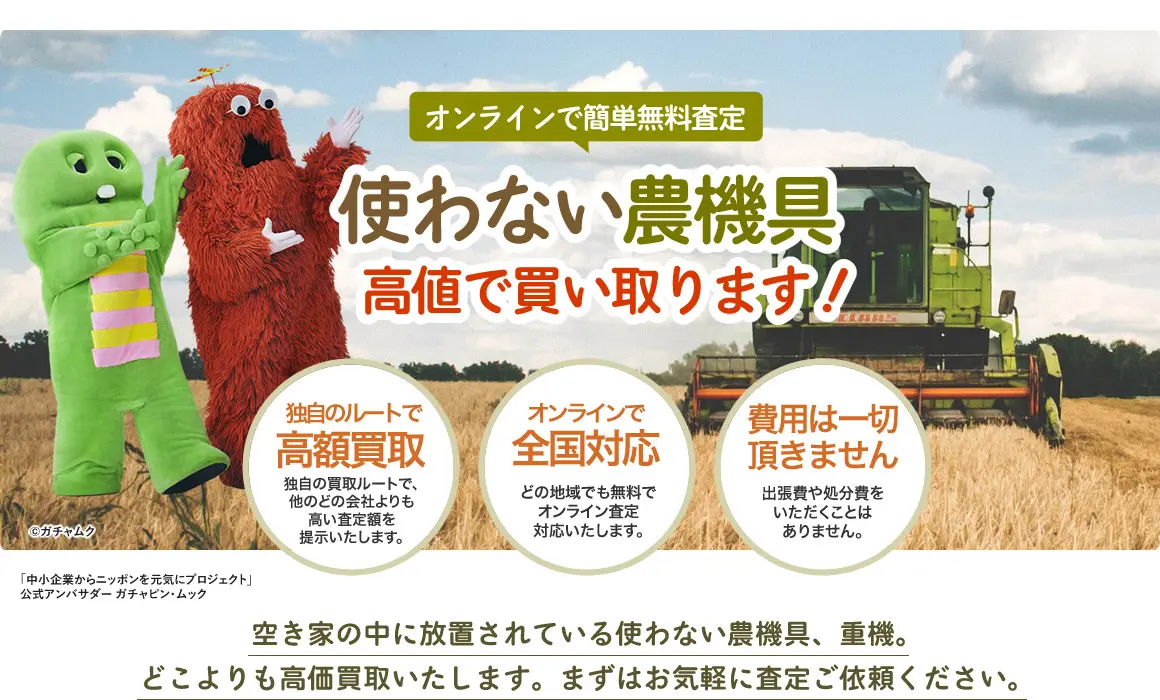 倉庫の解体マッチングで実績のあるサービスで、そのネットワークを活かして農機具買取も行っています。
