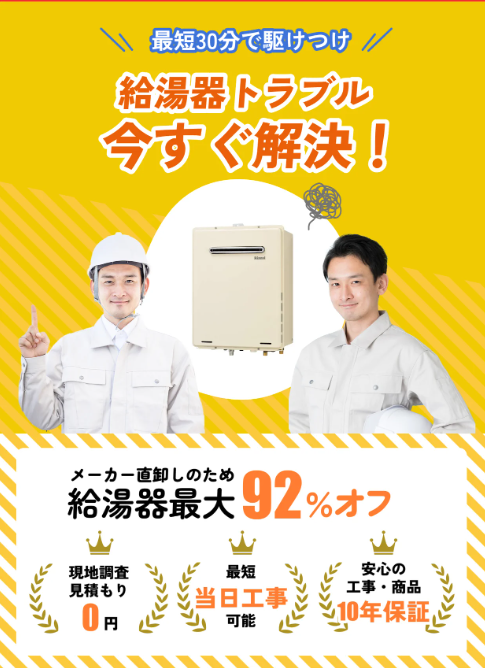 『お湯が出ない.com』が最大82%OFF+交換費が20%OFFとダブルでお得です。