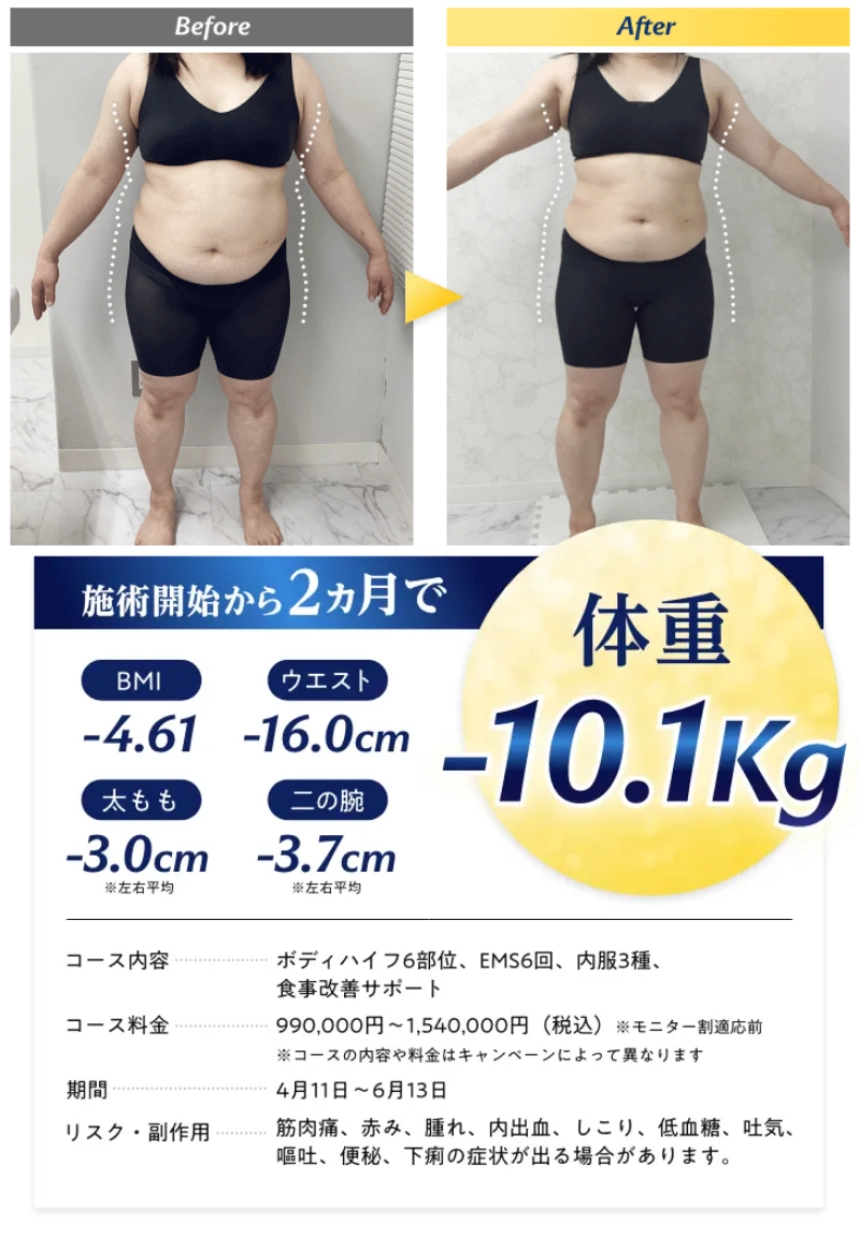 さらに、ダイエット効果を高めるために、医師の管理のもとで処方されたお薬に加え、ボディハイフやEMSといった施術も併用。これらが相乗効果となって、効率よく痩せることができました。
