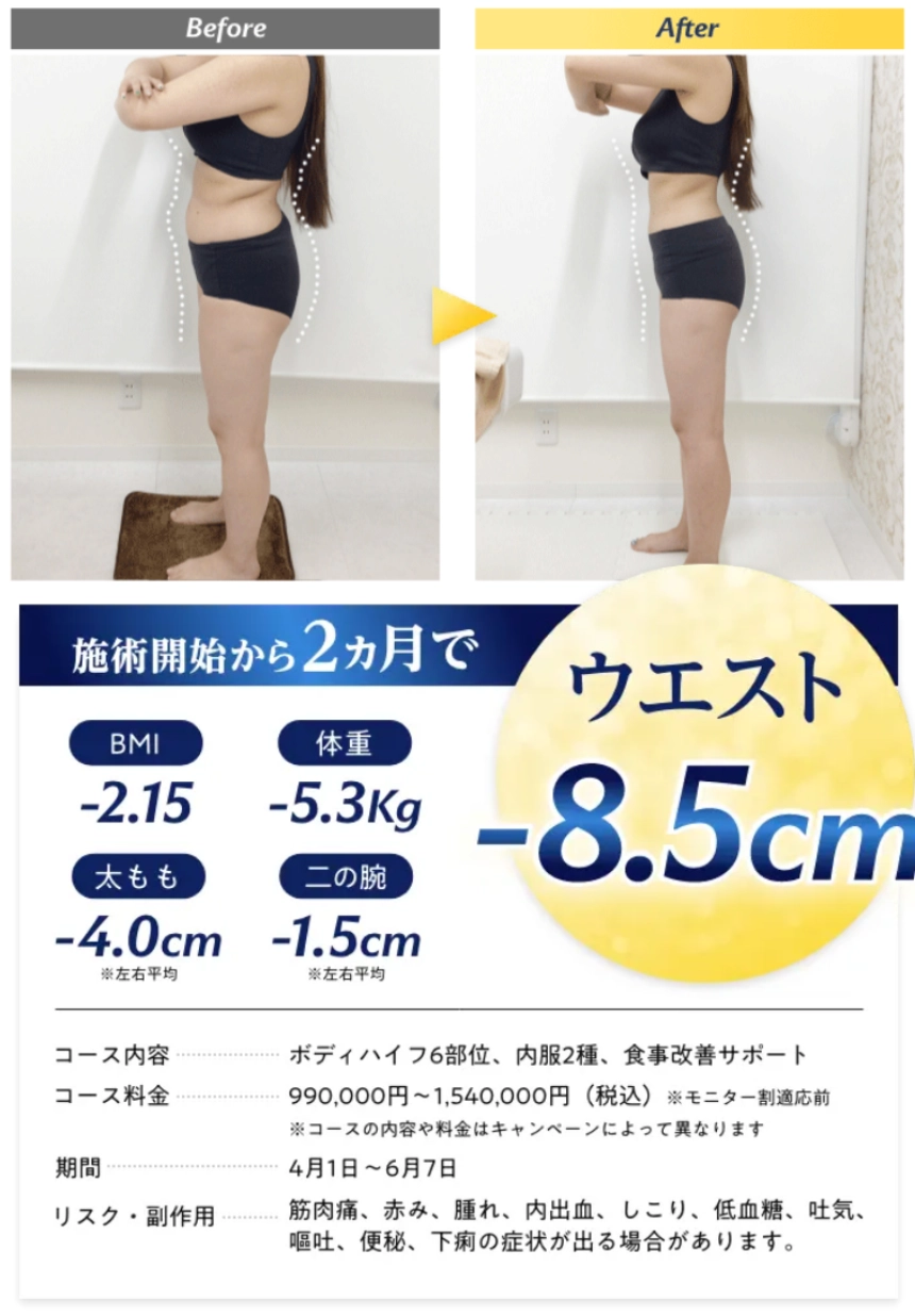 自分だけの努力じゃどうにもならなくなった時に医療ダイエットの広告につられて始めたら、3ヶ月で約12kgの減量に成功しました。