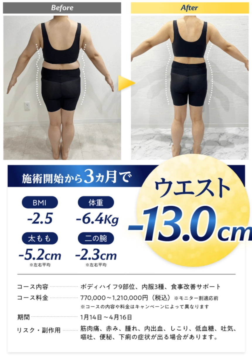 ![]() 18ヶ月分0円*3 1kg1万円で脂肪買取*3 体重58キロ以上脂肪買取金額2倍*4 モニター割最大80%OFF 58kg以上の方最大10万円OFF アンケート回答で5万円OFF 契約後アマゾンギフト券6万円プレゼント ご来院で5000円分のアマゾンギフト券プレゼント |