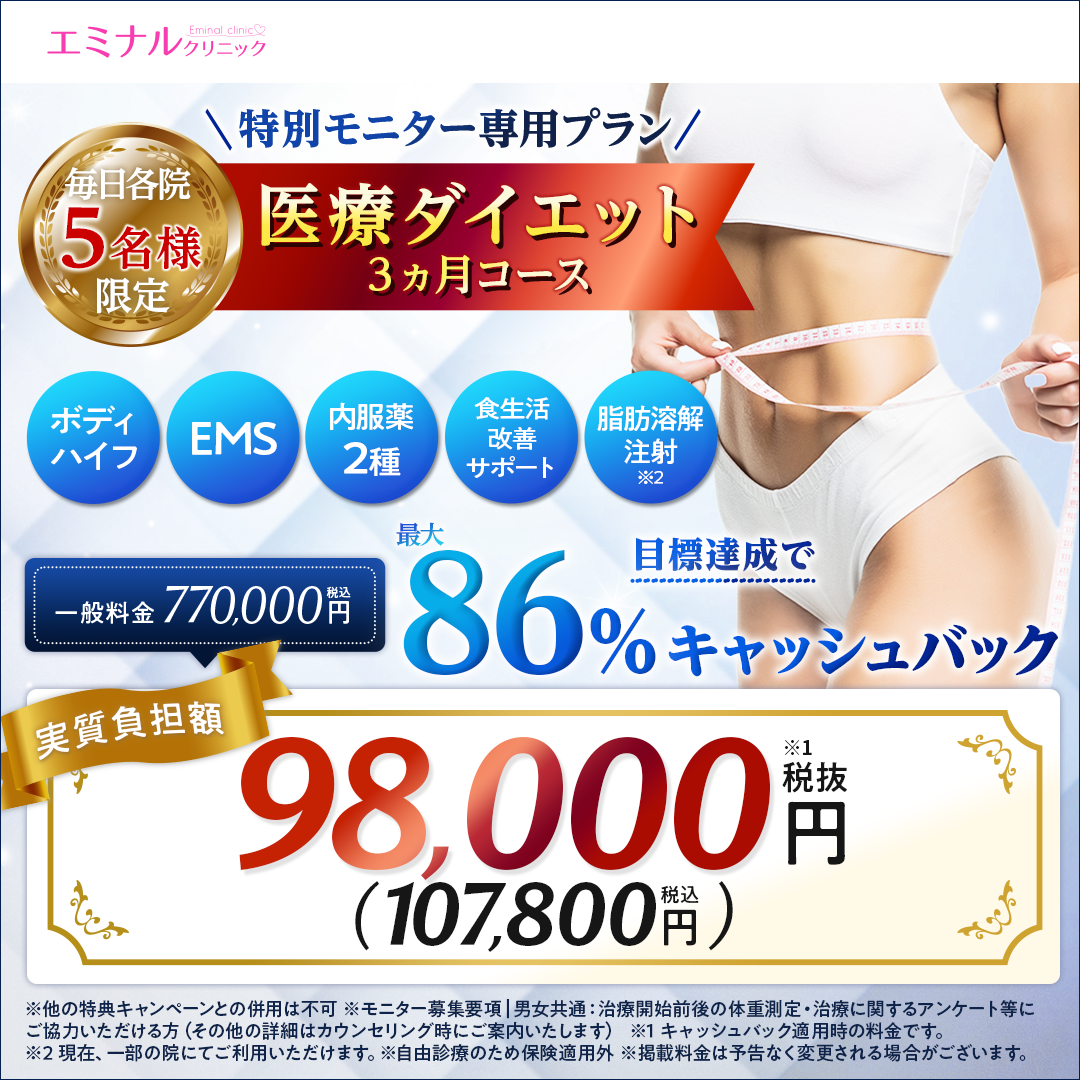 ※一般料金770,000円が毎日各院5名様限定で実質負担額107,800円。※他の特典キャンペーンとの併用は不可。※ モニター募集要項|男女共通:治療開始前後の体重測定・治療に関するアンケート等にご協力いただける方(その他の詳細はカウンセリング時にご案内いたします)※1 キャッシュバック適用時の料金です。※2 選べる美容施術は、初回施術時より施術可能です。各施術内容詳細はエミナルクリックページに別途記載しております。※3 脂肪溶解注射は現在、天王寺院、梅田院、梅田2号院、新宿院(レディース新宿院のカウンセリング受付は新宿西口院)、新宿西口院、池袋東口院、銀座院、上野院、福岡天神2号院(カウンセリング受付は福岡天神院)でご利用いただけます。※ 掲載料金は予告なく変更される場合がございます。※ 自由診療のため保険適用外。※脂肪冷却は特定院限定です。