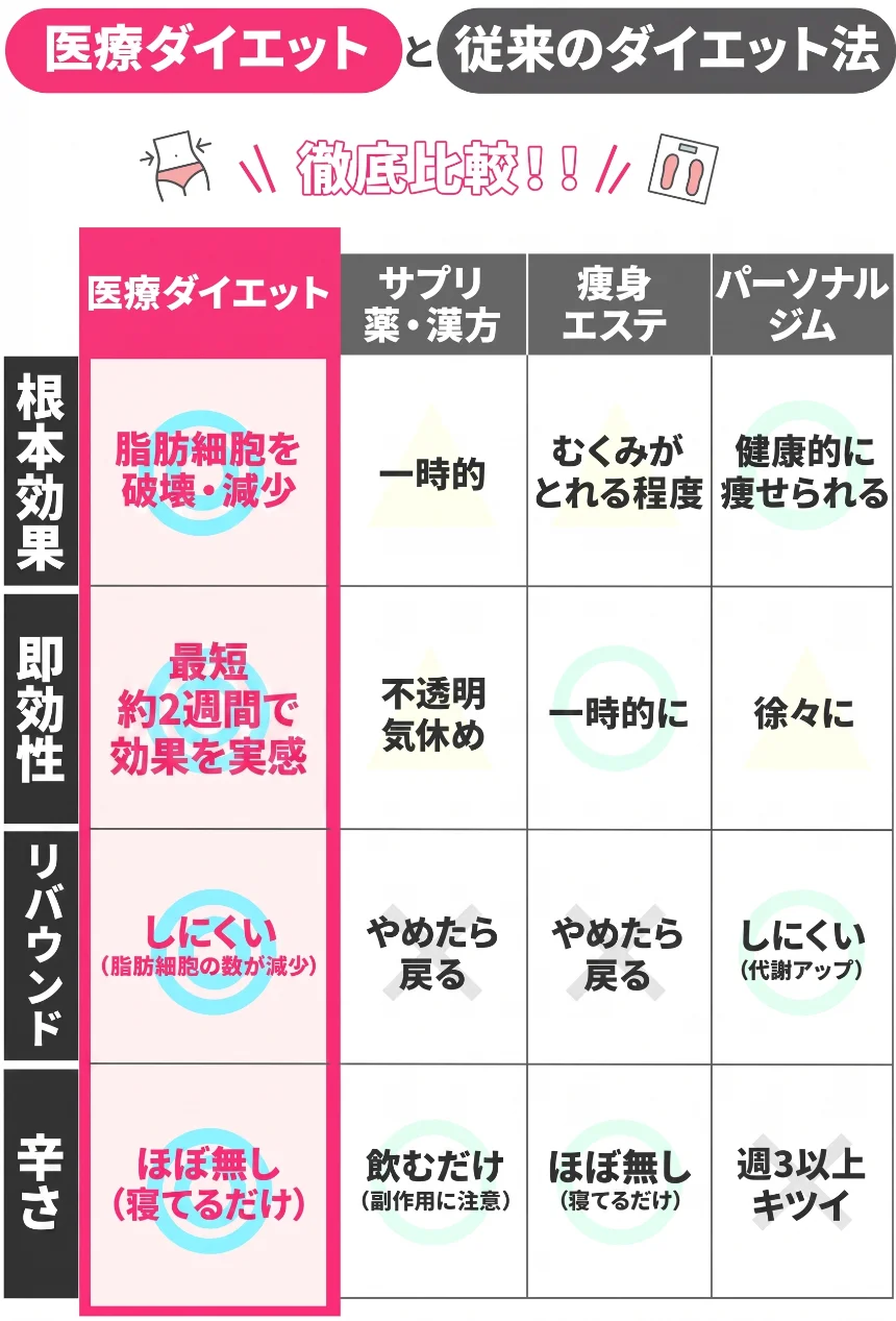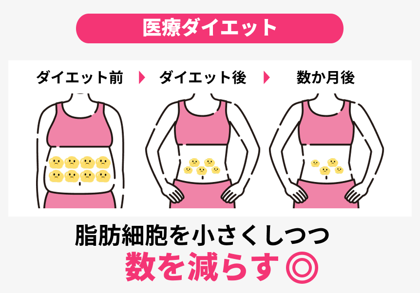 医療ダイエットなら、脂肪細胞そのものの「数を減らす」アプローチが可能。 だから、リバウンドしにくく、根本的な体質改善が期待できます。
