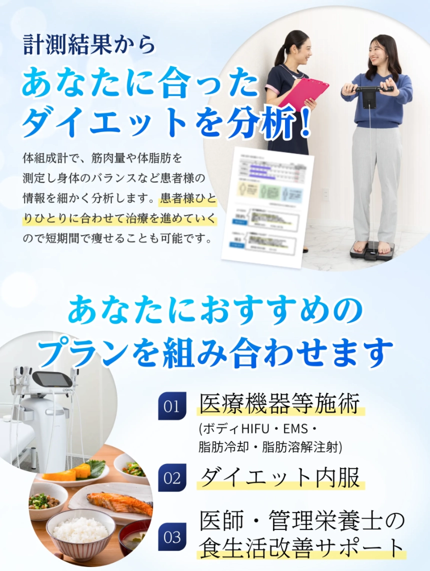 ![]() 機器施術・注射・GLP-1・食事指導を組み合わせ可能 体組成測定をもとにプランを提案 |