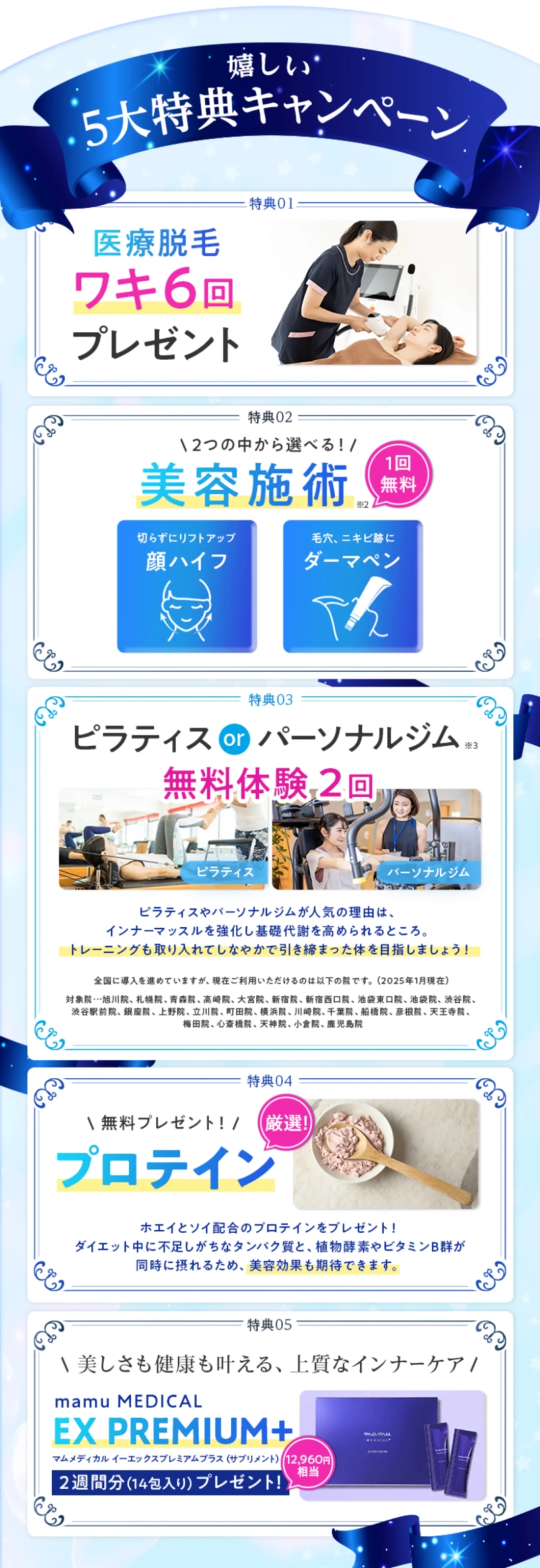 ![]() 特別モニター専用プラン最大86%キャッシュバック*1 医療脱毛ワキ6回プレゼント 選べる美容施術1回無料*2 プロテイン無料プレゼント サプリメント2週間分プレゼント |