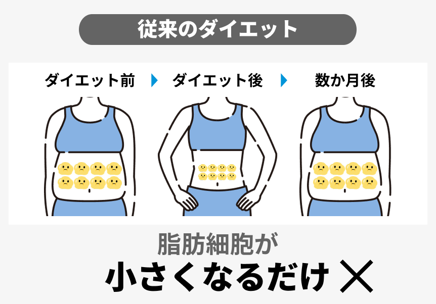 実は、ダイエットサプリや漢方、食事制限、ジムでの運動など従来のダイエット法では「脂肪細胞の数」は変わりません。