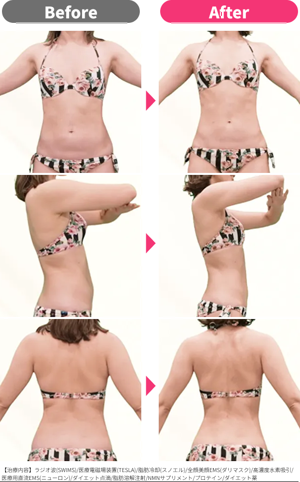 その上で、脂肪冷却「スノエル」で気になる部分の脂肪細胞を減らしつつ、医療EMS「テスラ」で筋肉量を増やして基礎代謝をアップ。