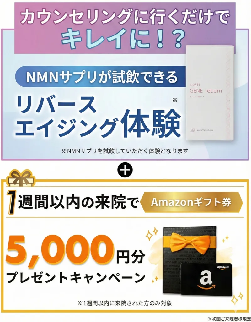 さらに、必要に応じてGLP-1受容体作動薬で食欲をコントロールし、オリジナルNMNサプリで体の内側からコンディションを整える、といった複合的なアプローチを提案してくれます。