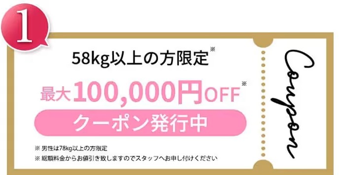 ![]() 15ヶ月分0円*1 1kg1万円で脂肪買取*1 モニター割最大80%OFF 58kg以上の方最大10万円OFF アンケート回答で5万円OFF ご来院で1000円分のアマゾンギフト券プレゼント |