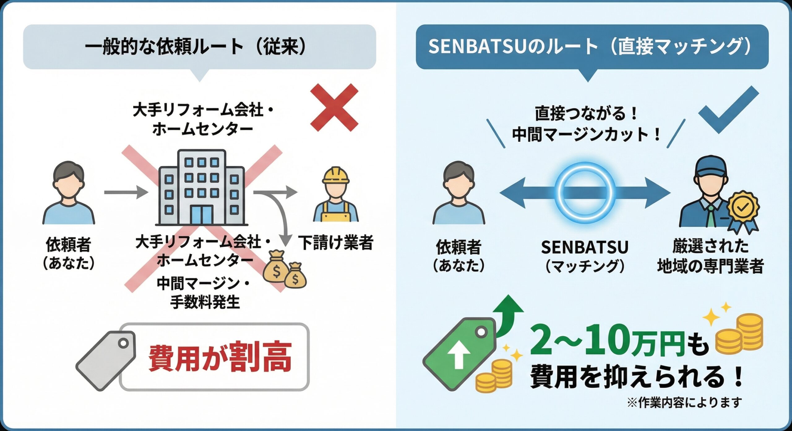 大手リフォーム会社やホームセンターを通さず、地域の専門業者と直接つながることで、余計な中間マージンをカット。作業内容によって2〜10万円も費用を抑えられます!