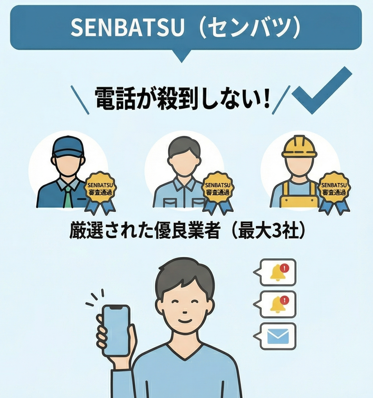 SENBATSUの審査を通過した本当におすすめできる優良業者だけ(最大3社)を紹介してくれるので、一般的な一括見積もりサイトのように不特定多数の業者から電話が殺到することもありません。